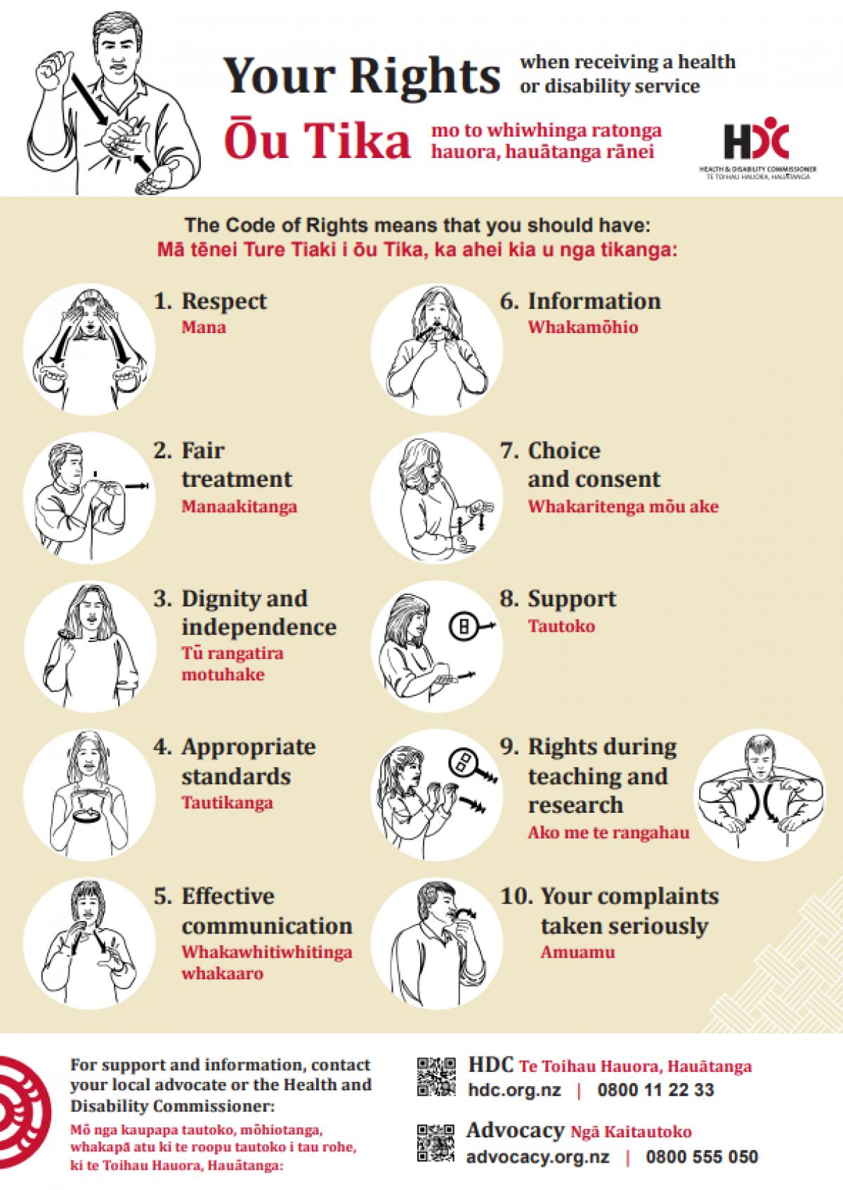 When you use a health or disability service in New Zealand, you have the protection of a Code of Rights. The Code of Health and Disability Services Consumers’ Rights provides the following 10 rights: